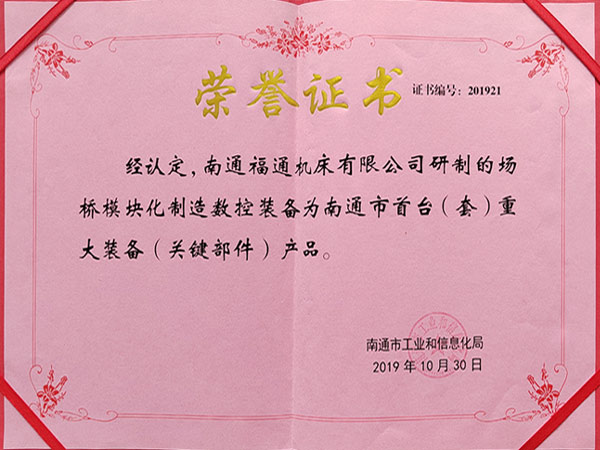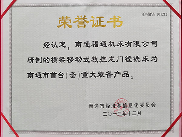 公司通過ISO9001:2015質(zhì)量體管理系認證、ISO14001:2015環(huán)境管理體系認證、ISO45001:2018職業(yè)健康安全管理體系認證、先后榮獲:中國機床行業(yè)十佳品牌、江蘇名牌產(chǎn)品、江蘇省質(zhì)量信得過企業(yè)、南通市科學技術進步獎、南通市AAA級重合作守信用企業(yè)、高新技術企業(yè)、南通市首臺(套)重大裝備產(chǎn)品等榮譽。